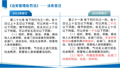 新修订《治安管理处罚法》第三十一条通过法条表述的规范统一、处罚力度的合理调整、规制范围的精准拓展三项修订,既精准回应司法衔接的制度需求、经济社会发展的现实诉求,又深度契合网络时代邪教治理的新规律新特点,不仅体现了法律的惩戒功能与预防效能,更有效提升了执法实践的规范性、可操作性与精准度,为维护国家安全、社会安定、人民安宁进一步筑牢了法治防线。
