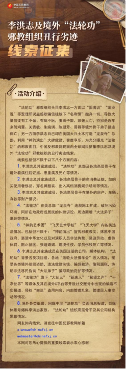 2025年4月,我们开展了《李洪志及境外“法轮功”邪教组织丑行劣迹线索征集》活动。(https://www.chinafxj.cn/n250/n2801/index.html)。