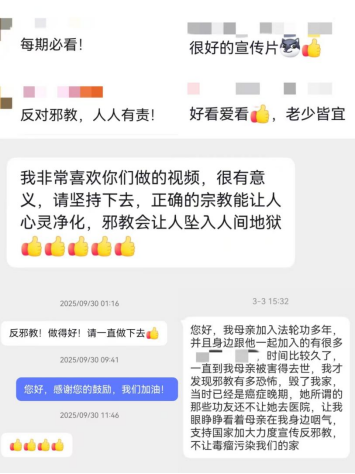 过去一年,我们共收到广大网民私信留言4000余条。既有支持反邪教工作的暖心鼓励,也有举报邪教违法犯罪活动的及时线索,以及群众咨询如何防范亲友误入邪教的真诚求助。每一条留言,都承载着社会各界对反邪教事业的关心与信任,都彰显了人民群众与我们并肩作战、同心筑牢反邪教防线的坚定力量。热心网民的一句句鼓励、一声声倡议,温暖而有力,成为我们深耕反邪教警示宣传、坚守岗位履职的不竭动力。一条条举报线索,更化作一把把利剑,直指邪教违法犯罪,为精准打击邪教活动、守护晴朗社会环境提供了重要支撑与坚实保障。