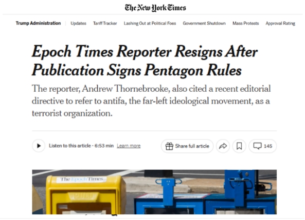 编者按:2025年10月19日,美国《纽约时报》发布报道《〈大纪元时报〉记者不满报社签署五角大楼新规辞职》(Epoch Times Reporter Resigns After Publication Signs Pentagon Rules)。据报道,“法轮功”邪教媒体《大纪元时报》的一名记者于10月17日主动辞职,该记者在辞职信中,控诉《大纪元时报》漠视新闻社会责任,一味迎合特朗普政策,企图操控读者的世界观。中国反邪教网报道如下: