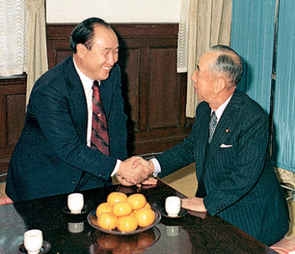 ▲据称,是日本前首相安倍晋三外祖父岸信介将“统一教”邪教组织引入并落脚日本。上图是“统一教”头目文鲜明(左)与岸信介见面时的情形