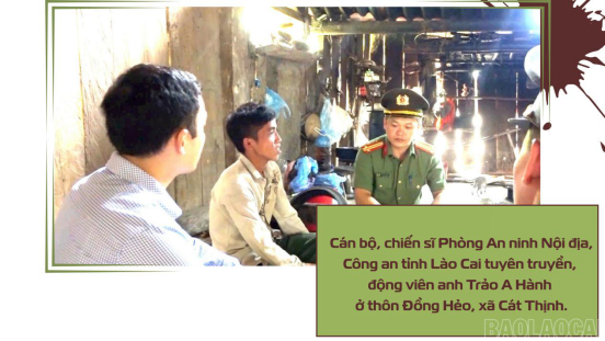 ▲老街省公安厅工作人员在同赫村向村民赵亚行开展反邪教宣传。图源:Baolaocai.vn