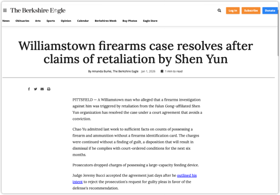 编者按:2026年1月1日,美国《伯克希尔鹰报》网站报道,美国马萨诸塞州威廉斯敦一宗涉枪案件近日通过法院协议得以解决,被告虞超承认无证持有枪支和弹药的事实,但辩称其行为系因曝光“法轮功”邪教内部黑幕后,担心遭该组织头目李洪志等人报复而采取的自卫措施。法院最终采纳了一项可避免定罪的方案:对虞超的相关指控将暂缓审理6个月,若其在此期间遵守所有规定,指控将被撤销。中国反邪教网编译如下: