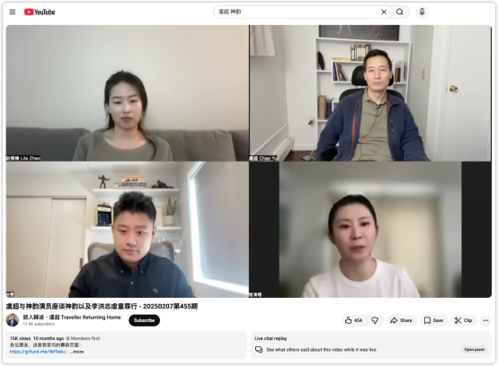 ▲虞超(右上)与部分前“神韵艺术团”演员通过社交媒体平台曝光“法轮功”邪教组织内部黑幕