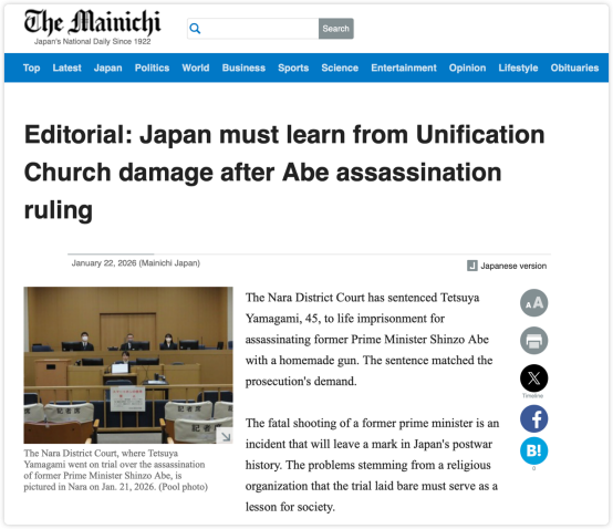 编者按:2026年1月22日,日本《每日新闻》英文版发表社论文章《日本必须从“统一教”问题中汲取教训:安倍遇刺案判决之反思》指出,安倍晋三遇刺案背后,暴露出邪教组织“统一教”对日本的长期危害。文章强调,该案件曝光“统一教”长期通过精神控制和不当募捐,对成员家庭,尤其是“第二代成员”造成深重伤害;同时也揭示了“统一教”与日本政界长期存在复杂关联,呼吁日本政府重新审视政界人士与该邪教组织的关系,并完善受害者救助机制。中国反邪教网编译如下: