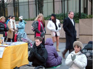 ▲2004年本文作者(黑衣打坐男子)与“法轮功”成员一起在纽约街头“发正念”