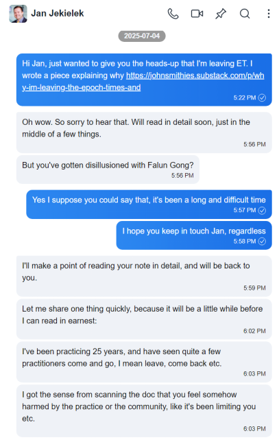 我:嗨,杰,只是提前告诉你一声,我要离开《大纪元时报》了。我写了一篇文章解释原因。(内容详见:《20年沉浮与决裂:一位前〈大纪元时报〉记者的邪教亲历与反思》)
