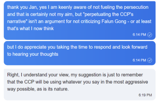 随后,《大纪元时报》最知名的人物之一、该报编辑杨杰凯(Jan Jekielek)给我发来了消息。我认为有必要将这段对话完整呈现,因为极具代表性,清晰地展现了“法轮功”成员在面对针对该组织的批评时所持的典型态度。