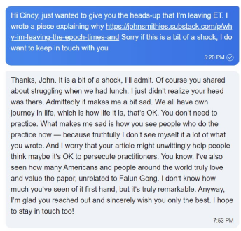我:嗨,辛迪,同样告知你一下,我要离开《大纪元时报》了。我写了一篇文章解释原因,(内容详见:《20年沉浮与决裂:一位前〈大纪元时报〉记者的邪教亲历与反思》)。如果这让你感到震惊,我很抱歉。我确实希望还能和你保持联系。