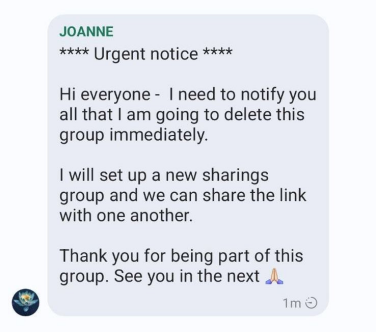 大家好,我需要立即通知大家,我将立刻解散这个群组。我会建立一个新的分享群,并把链接发给大家。感谢你们成为这个群组的一员。我们下一个群再见(合十)。