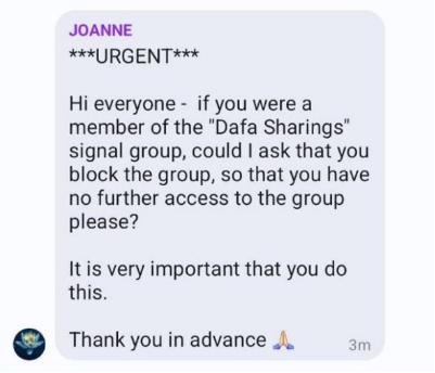 大家好,如果你曾是“大法分享”这个Signal群组的成员,请屏蔽该群组,以确保你无法再访问它。这非常重要。提前感谢(合十)。