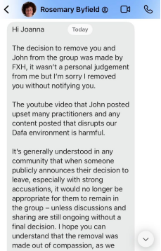 罗斯玛丽·拜菲尔德:嗨,乔安娜,今天将你和约翰移出群组的决定是由FXH(“法轮大法协会”)作出的,这并不是我个人拍板,很抱歉在未提前通知你的情况下移除了你。约翰发布的那个油管(YouTube)视频让许多修炼者感到不安,任何破坏我们“大法环境”的内容都是有害的。在任何社群中,通常都认为,当某人公开宣布自己离开,尤其是伴随着强烈指控时,他们就不再适合继续留在群组中——除非讨论和分享仍在进行,且尚未作出最终决定。希望你能理解,这样的移除是出于“善意”,我们真心希望你们不要继续造下更多业力。管理员无法删除Signal群组中他人发布的内容,因此群组随后被立即关闭,所有成员都被移除。