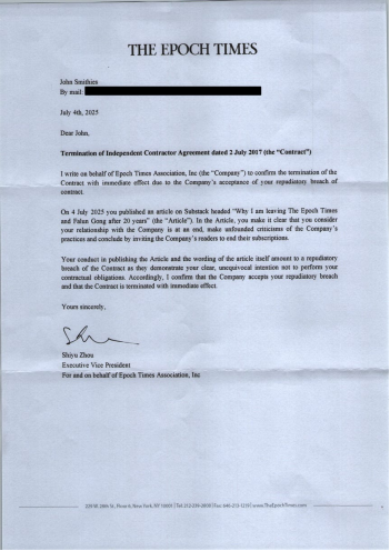 2025年7月4日,你在Substack上发表了一篇题为《我为何在20年后离开“法轮功”及其〈大纪元时报〉》的文章(以下简称“文章”)。文章中你明确表示与公司的关系已经结束,对公司的做法提出毫无根据的批评,同时呼吁读者终止订阅本报。