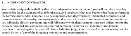 第8条的内容是:双方关系为独立承包人关系。你需自行承担因履行服务而产生的所有联邦、州及地方税款,并负责所有政府规定的社会保障、失业保险及工伤保险缴费。你须保证完全履行上述义务,并就任何违反行为导致的损失对公司进行全额赔偿。
