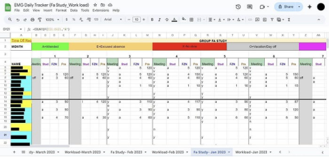 李洪志要求追随者定期参加有组织的学法和炼功活动。以下是2023年1月《大纪元时报》员工出勤、学法、炼功和“发正念”记录的样本。(注:样本记录包括来自伦敦、纽约和世界其他城市的员工)