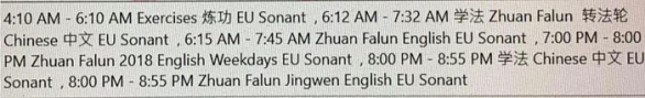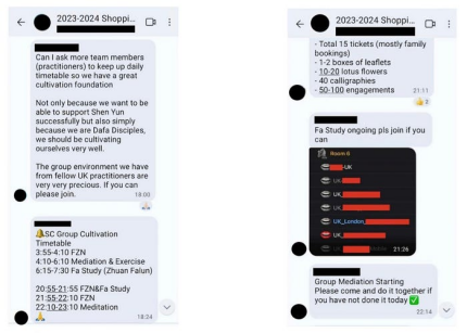 以下是英国“神韵购物中心”推广团队2023年的通讯记录。第一个示例是追随者在线集体炼功和学法的时间表,凌晨从3:55开始持续到7:30,晚上从20:55开始持续到23:10。据说这样做是为了让学员在外出工作或协助推广工作时保持良好的修炼状态。