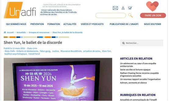 编者按:2026年3月13日,法国知名反邪教民间组织法国保护家庭和个人协会全国联合会在其官网Unadfi.org刊文《“神韵”:一场引发争议的舞蹈演出》,聚焦美国哥伦比亚广播公司“周日早新闻”相关报道,揭露“法轮功”邪教旗下“神韵艺术团”强迫未成年人演出和剥夺医疗权等问题。中国反邪教网编译如下: