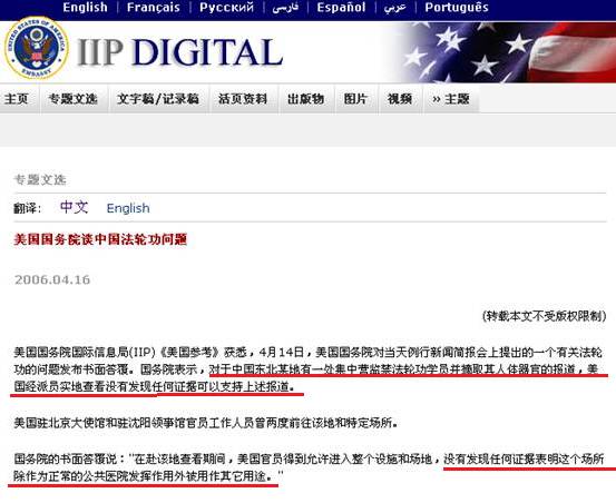 针对这一谣言,中国有关方面多次予以驳斥并谴责了“法轮功”的卑劣行径。“活摘”谣言也被国际社会所戳穿。2006年4月16日,美国国务院发言人肖恩·麦克康玛克(Sean McCormack)发表声明,对于中国东北某地有一处集中营监禁“法轮功”学员并摘取其人体器官的报道,美国经派员实地查看没有发现任何证据可以支持上述报道(详见下图)。CNN、美联社、华盛顿邮报、路透社、日本朝日新闻、渥太华公民报等媒体先后到苏家屯血栓病医院进行了实地采访,证实所谓“苏家屯集中营”纯属子虚乌有。此外,还有海外民运人士吴弘达在秘密进行的现场调查和专业分析的基础上,写出了《法轮功/苏家屯事件之我见》、《我对于法轮功媒体报导苏家屯集中营问题的认识及其经历》两个长篇报告,称“均未发现法轮功指称的集中营的痕迹”,“各方调查结果没有证实法轮功提出的情况属实”。皮之不存,毛将焉附?否定了所谓的“苏家屯集中营”,就是给“活摘”谣言釜底抽薪。