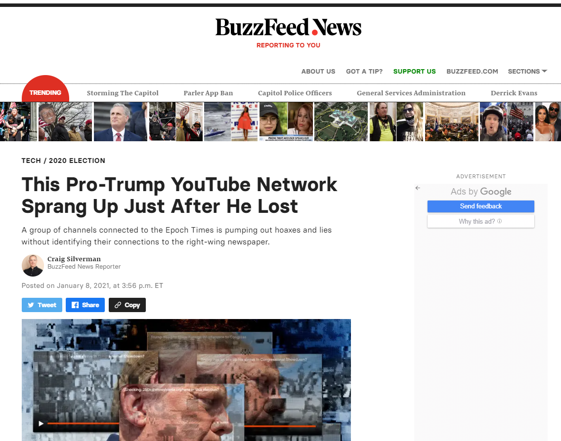 在去年美国总统大选日之后,出现了一系列与亲特朗普媒体《大纪元时报》相关的油管频道,它们作为(特朗普团队)造谣活动的一部分,目的是让特朗普能够连任,其中只有一个频道公开了它与《大纪元时报》的关系。《大纪元时报》以阴谋论做卖点,是特朗普最坚定的媒体盟友之一。