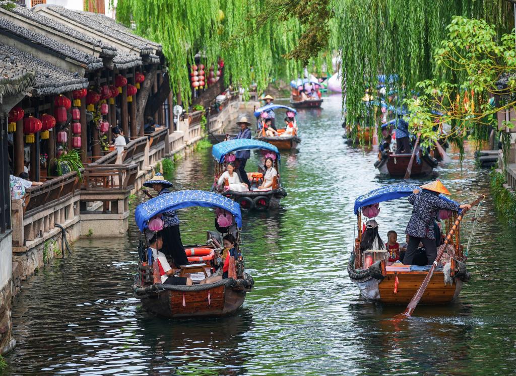 10月5日,游客在江苏省昆山市周庄古镇游览。国庆中秋假期,各地群众选择多种方式出游赏景、放松休闲,欢度“双节”。新华社发(周社根摄)