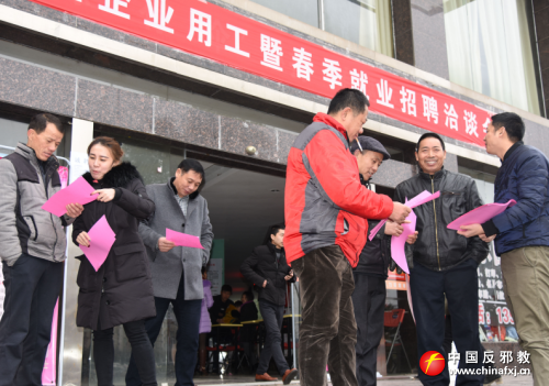 2月14日,江西省宜春市上高县委政法委反邪教工作人员走进上高县企业用工暨春季就业招聘洽谈会现场,对参加招聘会的企业及应聘人员进行反邪教宣传教育。