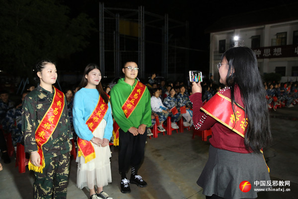 活动现场,篝火高高燃起, LED栏不断变换反邪教标语,反邪教宣传小展板整齐摆放舞台两边,同学们反邪教漫画习作、心得体会等分类摆放长桌上供交流学习,身披“我为反邪教代言”绶带的小斗士们适时地把反邪教宣传资料发放给同学们。大家手挥小国旗围坐一起,尽情地欣赏同学们自编自导自演反邪教节目,欢呼声、谈笑声、喝彩声此起彼伏。宜州区第三小学学生精彩表演《校园反邪教三句半》得到了大家热烈的掌声。来自河池学院的两位大学生反邪教代言人领唱《我和我的祖国》把反邪教篝火主题晚会推向了高潮。