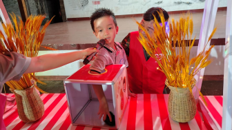 隔壁的“摸秋”游戏区更是热闹,孩子们在家长的协助下,蒙着眼睛在箱子里摸水果并成功辨认出水果的名字。当摸到寓意“平安”的苹果时,现场响起欢呼——志愿者讲解“平安不仅是团圆,更是远离歪理的守护”,将反邪宣传藏进游戏乐趣里。接下来,由平安法治办工作人员讲解反邪教知识,从邪教的伪装手段、危害、常见邪教种类,到如何辨别、防范和抵制邪教,工作人员循循善诱,并通过提问的方式引导孩子们自主思考,让安全意识在问答中扎根。
