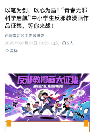 为进一步深化反邪教警示教育宣传工作,切实提高未成年人识邪防邪拒邪的意识和能力,2025年7月至10月,山东省青岛市西海岸新区工委政法委、区科学技术协会、区教育和体育局、区法学会、区广播电视台联合举办了“青春无邪 科学启航”中小学生反邪教漫画作品征集活动。