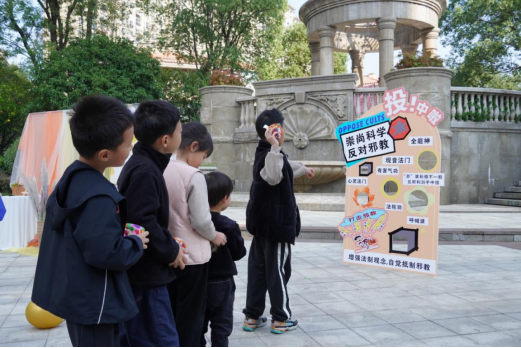 与此同时,专属反邪教宣传打卡区同样人气高涨。街道设计了包含“远离邪教”“科学相伴”等主题的打卡展板,居民与学生手持“我是反邪小卫士”“崇尚科学反对迷信”等标语牌拍照留念,同步领取反邪教宣传手册。志愿者在打卡过程中,用通俗易懂的语言讲解邪教的本质特征、常见骗局及危害,结合“祷告治病”“虚假祈福”等典型案例,拆解邪教诱骗群众的套路,引导大家牢记“不轻信、不参与、不传播”的防邪三原则。