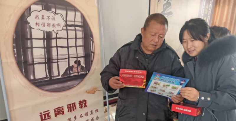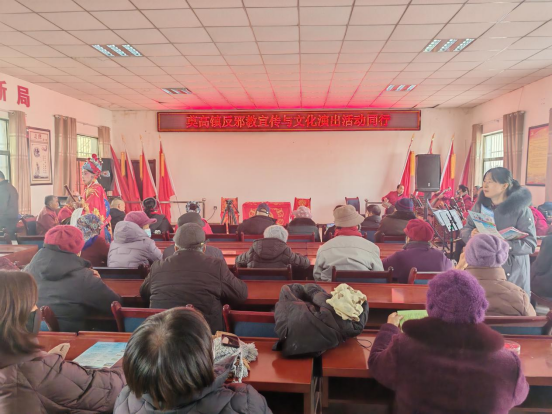 演出前,工作人员提前在现场设置反邪教宣传展板,发放反邪教宣传彩页和印有反邪教字样的抽纸盒,用漫画图解、案例剖析等形式,向到场村民讲解邪教的种类、特征及危害,现场解答群众疑问。演出过程中,除了精彩的戏曲表演,还穿插“邪教害死人”等三句半节目,通过演员贴近生活的表演和原汁原味的话语,将邪教“精神控制、聚敛钱财”的行径真实演艺出来,台下观众频频点头、掌声热烈。