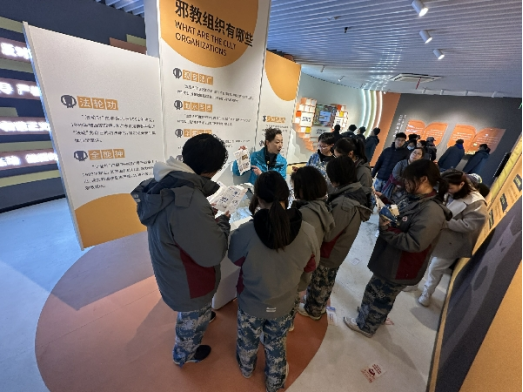 在宣讲员的带领下,学生们参观了上海市反邪教警示教育基地,系统学习反邪知识,了解国内外邪教组织及其社会危害。展厅内知识讲解、危害警示、实物展示、互动体验等功能区各有侧重,借助多媒体互动、实物陈列等青少年易接受的形式,让反邪教育既有趣味性,又能落到实处。