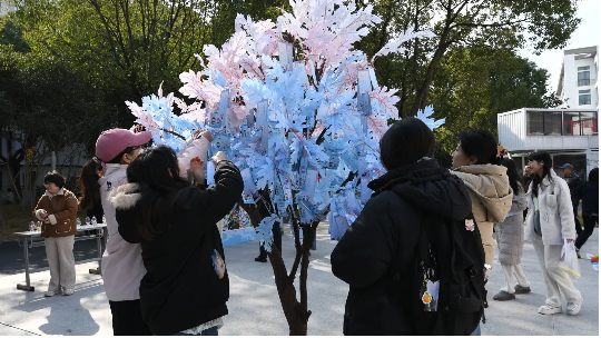 活动现场还摆放了一棵温馨的许愿树。同学们踊跃驻足参与,纷纷拿起许愿卡,认真写下反邪心愿,将其挂在树枝上。一张张许愿卡随风轻摆,直观地展现了大家对无邪生活的美好祝愿。