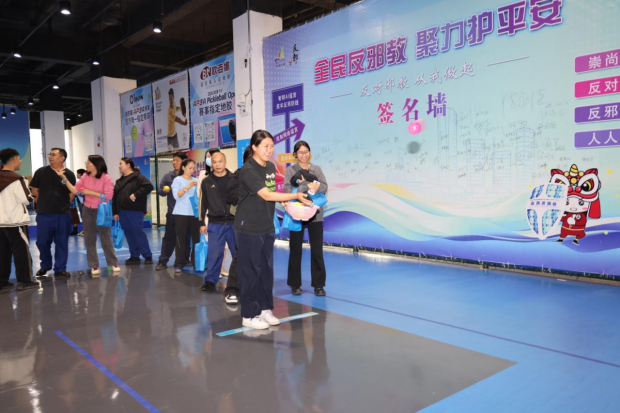 场外设置的“反邪先锋”游戏区同样人气十足。四大特色游戏让居民在互动中“玩中学、学中玩”,有效提升对邪教危害的辨识能力。“横扫‘歪理邪说’”保龄球游戏中,群众手持球具击倒贴有邪教谬论标签的瓶体,直观感受“破除谎言”的力量;在“精准破邪”匹克球投桶挑战里,参与者需边投球边喊出反对邪教的口号,强化记忆深度;“护心前行”障碍赛要求选手托球穿越“谣言迷雾”等障碍区,象征着在生活中坚守科学立场;“齐心迈步”巨人脚步则通过团队协作前进的形式,传递“全民共反邪教”的理念。