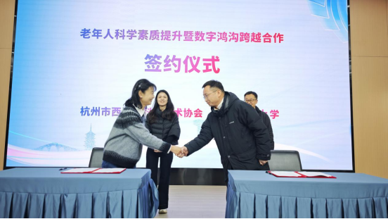 为推动老年人科学素质提升工作提质增效,现场,西湖区科学技术协会与杭州社区大学共同签署了老年人科学素质提升暨数字鸿沟跨越合作协议。双方未来将在整合资源,通过课程开发、场地共享、培训赋能等多元化合作形式,为老年人搭建便捷、实用的学习平台。