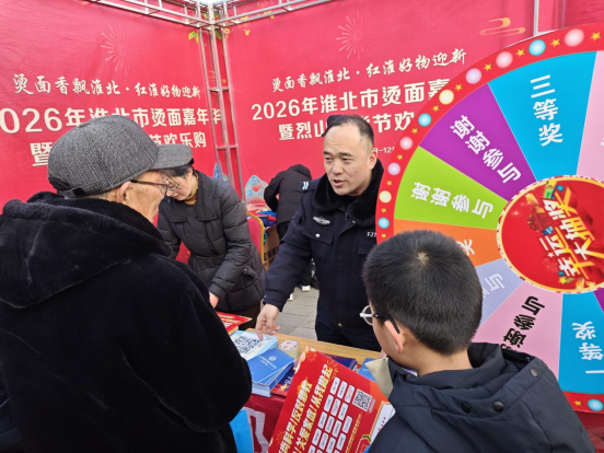 1月10日,在安徽省淮北市烫面嘉年华热闹开市、街巷飘香之际,淮北市烈山区委政法委联合区司法局、区商务局、烈山镇等单位,在人流密集的节庆现场开展了“崇尚科学反邪教 民俗传情护平安”主题宣传活动,让反邪教宣传接地气、入人心。