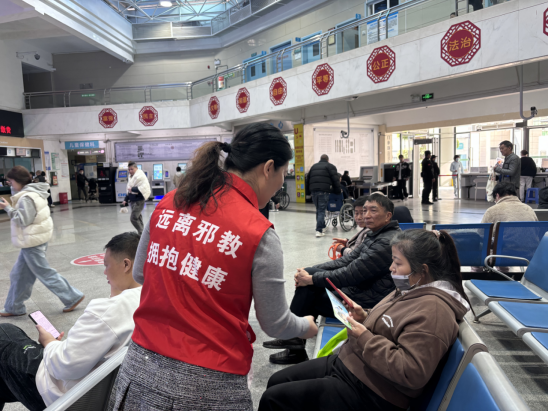 医院作为群众健康守护地,人流量大且群体特殊,易成为邪教组织渗透的潜在目标。活动当天,工作人员精准把握患者候诊“黄金时段”,在门诊大厅、住院部走廊等重点区域搭建宣传展台,悬挂“全民反邪教 聚力护平安”主题横幅,电子屏循环滚动反邪教警示标语与警示教育短视频,营造浓厚宣传氛围。反邪教工作人员结合真实案例,向过往群众揭露邪教组织冒用“气功治病”“宗教祈福”等名义诱骗患者放弃正规治疗、聚敛钱财的惯用伎俩,深入剖析邪教反人类、反科学、反社会的本质危害。医护志愿者则立足专业视角,讲解“信邪误病”的惨痛教训,强调“生病应遵医嘱科学诊疗,健康需靠合理作息与正规医疗”的核心理念,引导群众树立科学健康观。