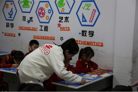 黑板上,“童墨书正气·北疆护平安”十个大字格外亮眼。练字班的老师们俯身围在课桌旁,挨个纠正孩子们的握笔姿势,借着汉字书写讲解反邪教的道理:“写‘正’字要横平竖直,做人也是如此,堂堂正正心不偏,就不会被歪门邪道迷惑。”生动的比喻让孩子们听得认真,频频点头。