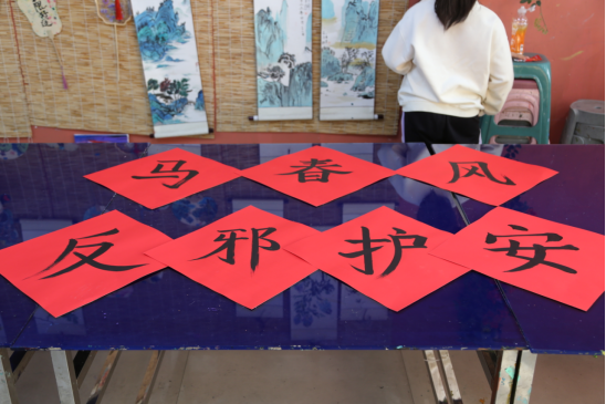 一旁的新春题字区更是年味拉满,美术馆老师提笔蘸墨,在大红宣纸上挥毫泼墨,反邪护安四个大字笔力遒劲、醒目亮眼,搭配马踏春风、新年快乐等吉祥祝福语,鲜红笔墨喜庆十足。孩子们围在桌旁,目不转睛地欣赏书法创作,红装、木石画、大红题字交织相融,小年的喜庆氛围扑面而来,反邪护安的理念也伴着墨香,悄悄浸润童心。