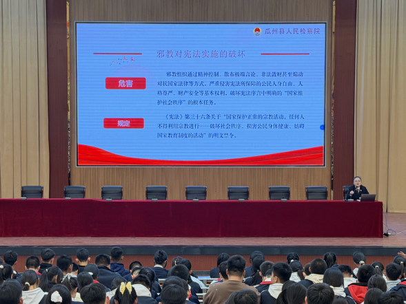 宣讲中,反邪教宣传成为“重点一课”。政法干警用形象比喻、对比讲解,揭开邪教的虚伪面具,深刻揭露邪教反科学、反人类、反社会的真实面目,明确参与邪教活动属于违法犯罪行为。通过以案释法、播放警示教育短片、互动问答等形式,帮助师生认清邪教危害,掌握不听、不信、不传、不参与的防范要诀,牢记遇到邪教宣传、可疑人员及非法活动时,第一时间向老师、家长报告或拨打 110 报警。