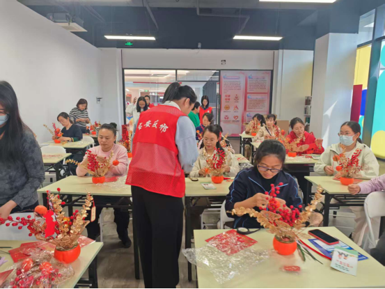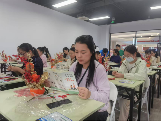 活动现场,色彩缤纷的手工材料整齐摆放,橙红色的仿真花枝、精致的装饰配件在桌面上熠熠生辉。在专业手工老师的指导下,妇女姐妹们围坐在一起,穿针引线、精心搭配,将普通的材料转化为一件件充满生机与祝福的手工作品。大家专注地摆弄着手中的材料,原本陌生的邻里关系在指尖的互动中悄然升温。不一会儿,一盆盆寓意 "红红火火""平安顺遂"的仿真花艺作品便在大家手中诞生,橙红的花朵与翠绿的枝叶相映成趣,成为活动现场一道亮丽的风景线。在手工制作的间隙,工作人员身着红色马甲,穿梭在人群中,向大家发放反邪教宣传手册,用通俗易懂的语言讲解邪教的本质、危害及防范方法。工作人员结合典型案例,深入浅出地剖析了邪教如何伪装成 "养生""心灵成长" 等名义渗透群众生活,提醒大家要提高警惕,远离邪教侵害。
