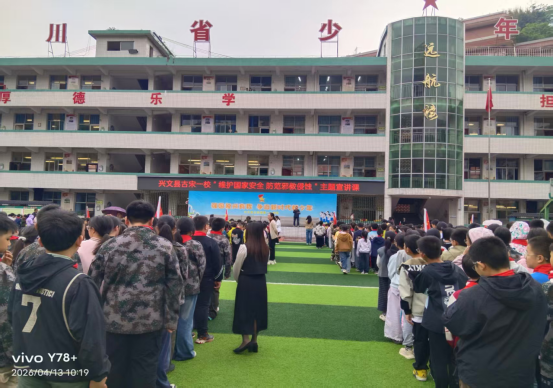 在第十一个全民国家安全教育日来临之际,4月13日清晨,四川省宜宾市兴文县反邪教协会志愿者走进兴文县第一小学校,借助周一升旗仪式,面向全校2000余名师生开展反邪教宣传教育活动,将反邪教警示教育与国家安全教育深度融合,紧扣“统筹发展和安全 护航‘十五五’新征程”活动主题。