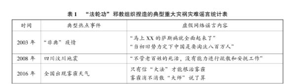 凡遇重大灾祸灾难之时,正是各种邪教网络谣言盛行之际。表1按年份统计了“法轮功”邪教组织捏造的典型重大灾祸灾难网络谣言,这些谣言已被国内和国际社会充分证实是完全虚假、极端错误和十分荒唐的。