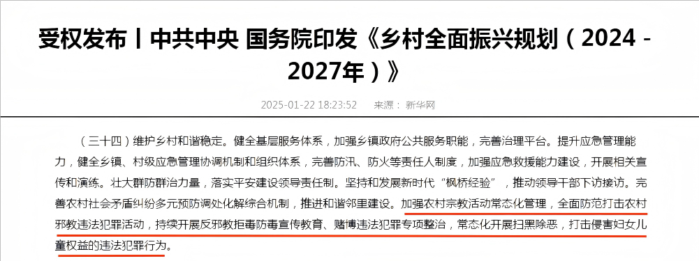 《乡村全面振兴规划(2024-2027年)》第十条第34项“维护乡村和谐稳定”提出,加强农村宗教活动常态化管理,全面防范打击农村邪教违法犯罪活动,持续开展反邪教拒毒防毒宣传教育、赌博违法犯罪专项整治,常态化开展扫黑除恶,打击侵害妇女儿童权益的违法犯罪行为。