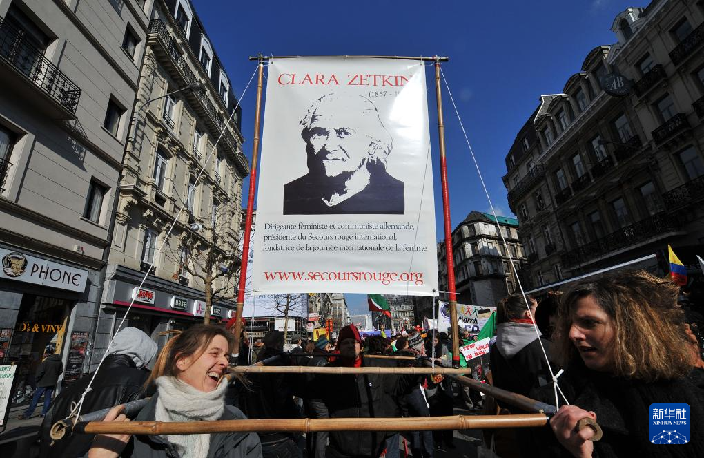 2010年3月6日,在比利时首都布鲁塞尔,妇女代表抬着著名女政治活动家、三八国际妇女节的倡导者克拉拉·蔡特金的画像参加庆祝三八国际劳动妇女节游行。新华社记者 武巍 摄