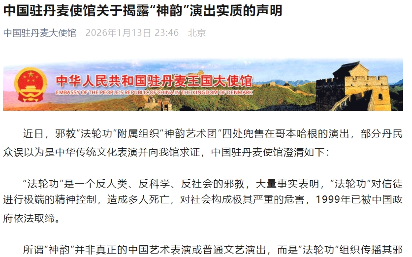 1月13日,中国驻丹麦大使馆发布关于揭露“神韵”演出实质的声明。 2026-01-14