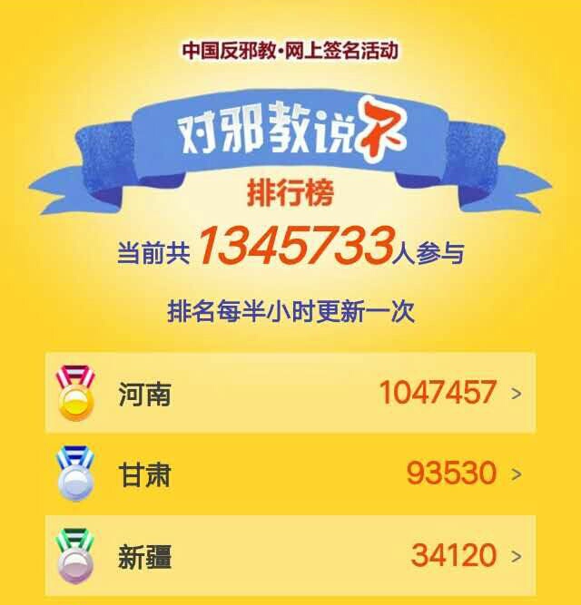 9月22日,中国反邪教“一网两微”上线并同步开展“对邪教说不”网上签名活动。河南省积极动员全省干部群众参加网上签名,充分发挥正在建设当中的全省反邪教新媒体矩阵的作用,目前已有104万人在网上签名,对邪教说不!目前,河南省网上签名人数排名高居全国第一。