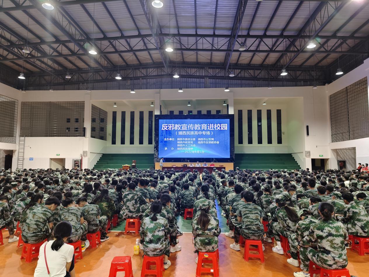 开学伊始,为打造校园反邪教阵地,防止邪教渗透,增强师生们反邪防邪意识和能力,强化反邪教宣传的力度,努力营造积极向上、健康和谐的校园氛围,9月1日,广西壮族自治区百色市靖西市委政法委组织公安局、教育局、反邪教协会在靖西市民族高中举办2022年秋季“开学第一课”反邪教宣传进校园活动。靖西市委政法委、市公安分局、市教育局、反邪教协会等相关部门负责同志、学校师生代表约1000余人参加本次活动。