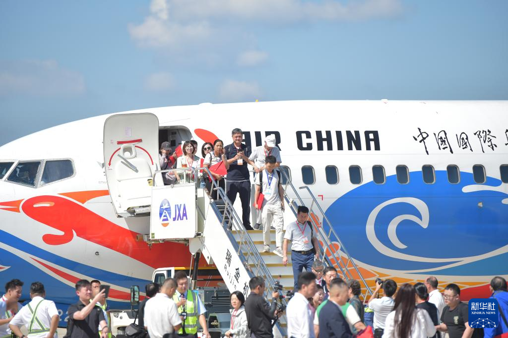 9月28日,由中国国际航空执飞的北京大兴至瑞金航班抵达瑞金后,乘客走出机舱。 新华社发(杨鑫 摄)