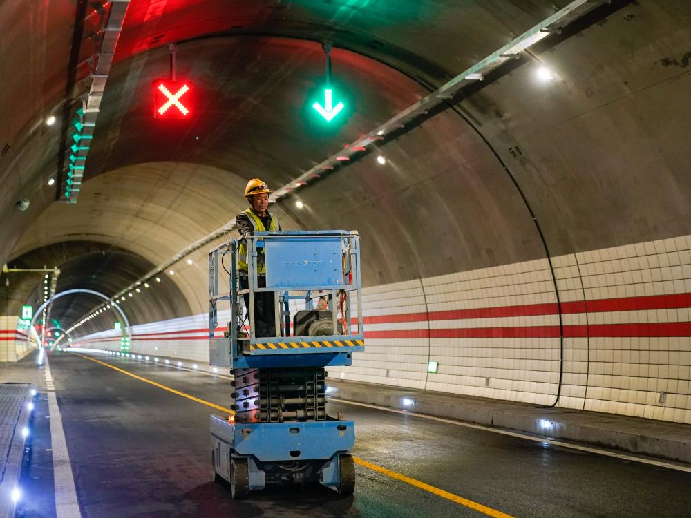 2025年9月28日,中铁十一局的工人在四川夹金山隧道内进行收尾巡查施工。新华社记者 王曦 摄