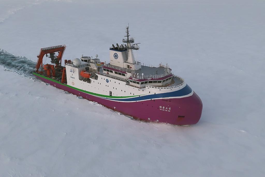 “探索三号”在北极密集冰区破冰航行。(自然资源部供图)